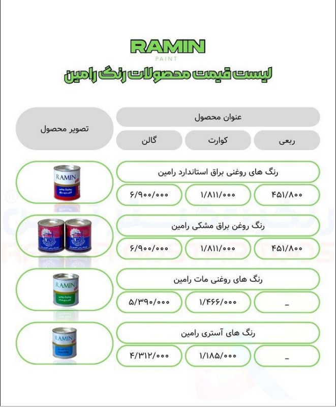 لیست قیمترامین1404/08/28لیست قیمت آبان ماه شرکت رنگسازی رامین ( برای دانلود روی پی دی اف زیر کلیک کنین) رامین.pdf اشتراکگذاری مقالهبا یکی از روش های زیر میتوانید لینک این صفحه را به اشتراک بگزارید کپی لینک